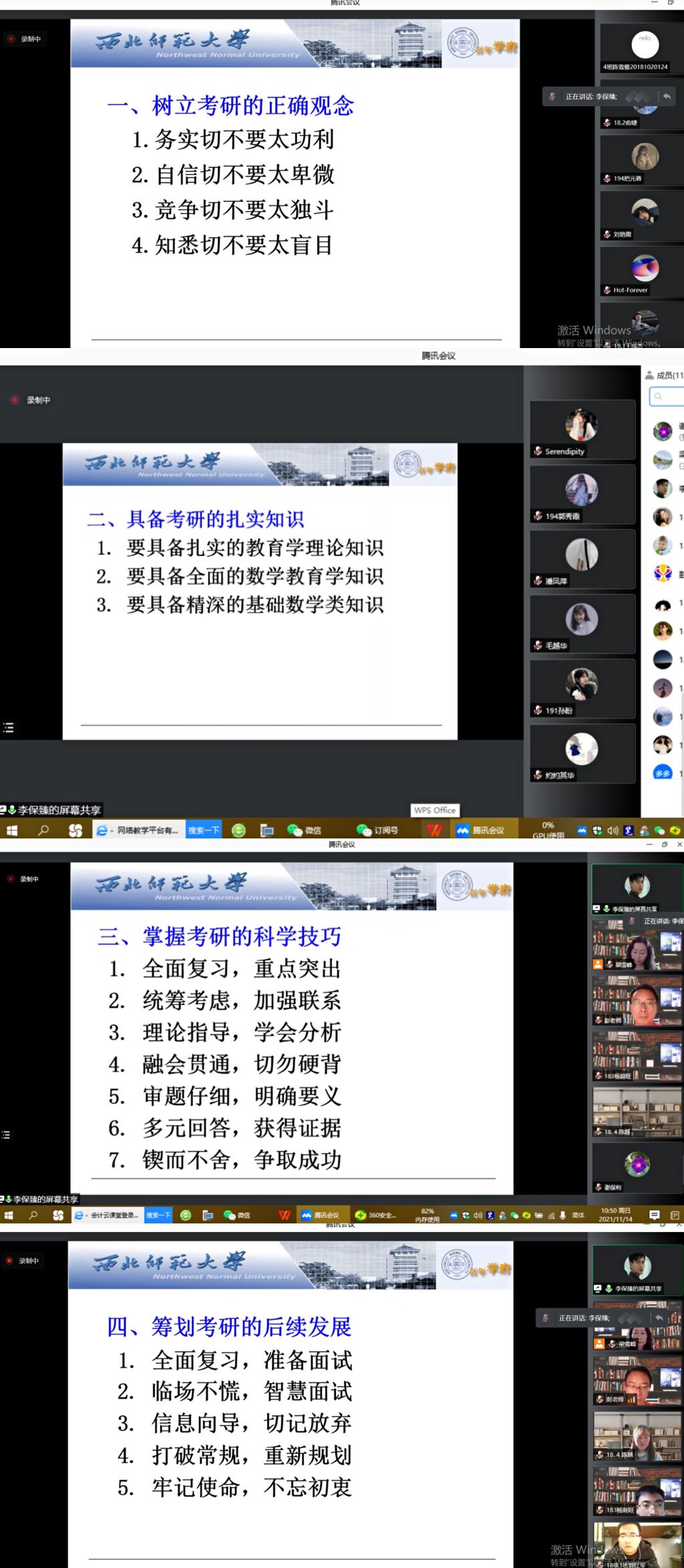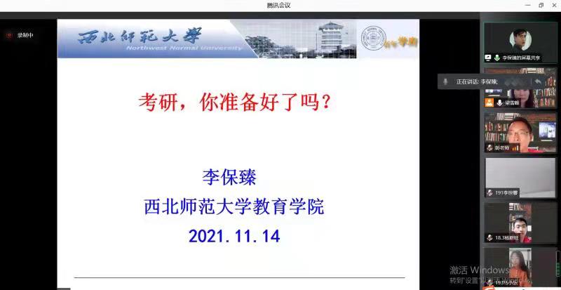 2021年11月14日,应beat365官方网站邀请,西北师范大学李保臻教授通过腾讯会议作了题为《考研,你准备好了吗?》辅导报告。18级报考专硕同学、19级准备考研同学、学院领导及部分感兴趣的教师共120余人参加,会议由学院分管教学领导主持。