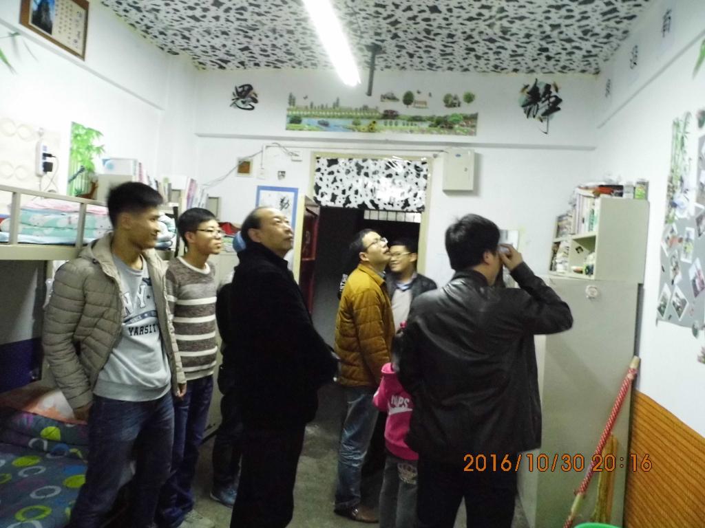 为了加强学生宿舍管理,规范学生行为,提高大学生精神风貌,我院积极响应学校“五星级文明宿舍”活动的号召,beat365官方网站于2016年10月30日晚7:30进行了“星级文明宿舍”检查活动。在我院党总支书记吴树雄、院长王三福、副书记崔德旺、副院长马维学、副院长谢保利的带领下,辅导员、各班班主任以及部分学生会人员深入博学、云帆公寓我院学生宿舍,对我院学生“星级文明宿舍”活动的创建情况进行了检查。本次检查以宿舍卫生、宿舍安全、宿舍主题和宿舍文化氛围建设为重点,分两组对男生宿舍和女生宿舍进行了检查。