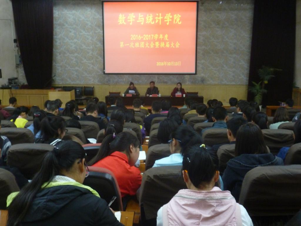 2016年10月13日晚19:00我院在1号报告厅举办了2016―2017学年度第一次班团暨换届大会,出席本次大会的有党总支书记吴树雄、辅导员包丽莉、张璐以及各班班委和学生会全体成员。