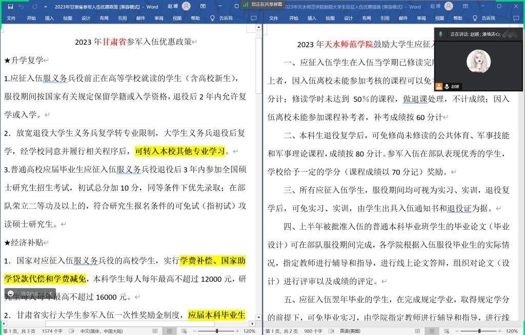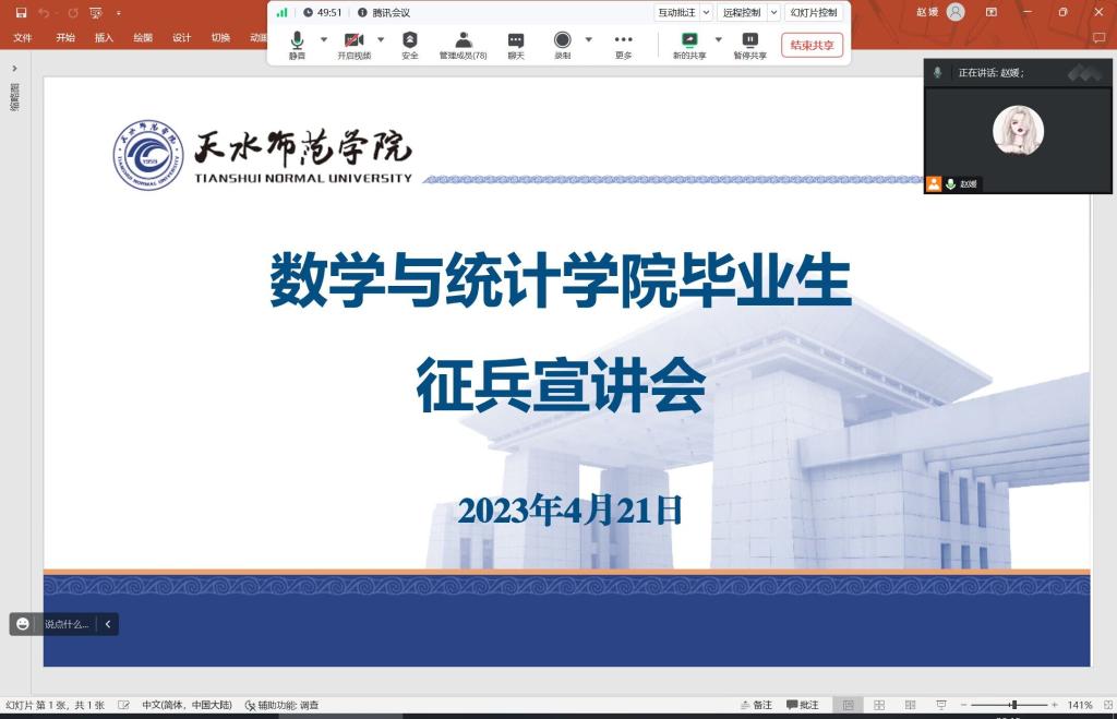 “携笔从戎 无上光荣”,为激发学院学生报效祖国、应征入伍的热情,帮助大学生了解、掌握应征入伍相关政策,营造应征光荣的浓厚氛围。2023年4月21日,beat365官方网站举办了2023年下半年大学生应征入伍政策解读宣讲会。宣讲会通过线上线下相结合的方式召开,会议由学院分管征兵工作的辅导员赵媛老师主持,学院26个班级的班长、团支书、大数据专业学生及学院有应征入伍意愿的学生参加了会议。