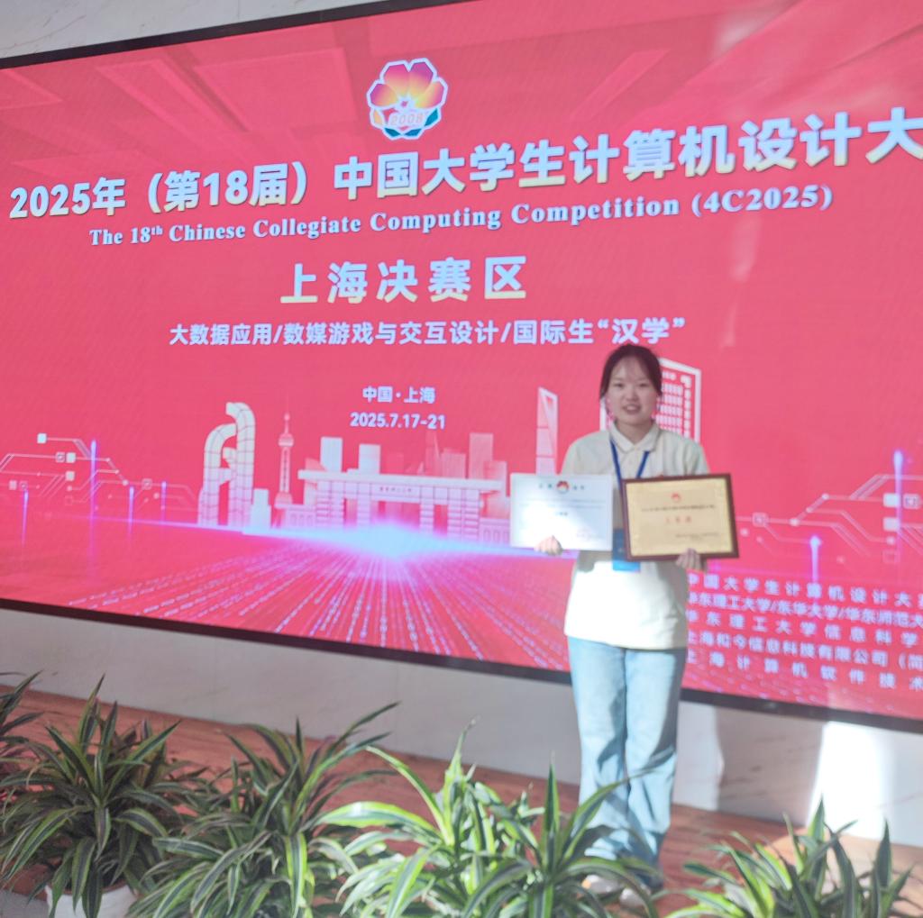 7月21日,2025年(第18届)中国大学生计算机设计大赛全国总决赛在上海华东理工大学圆满举行,本次赛事吸引全国500余支队伍同台竞技,经过紧张激烈的角逐,beat365官方网站刘倩茹和机电与汽车工程学院林欣2名同学组成的团队,凭借作品《数览天水—大数据驱动的古城沉浸式导览系统》脱颖而出。在决赛现场,刘倩茹同学代表团队进行项目路演与答辩,通过出色的视觉呈现、清晰的方案阐述与自信的答辩互动,全面展示了该作品的创新价值与社会效益,在大数据应用赛道中荣获全国三等奖。