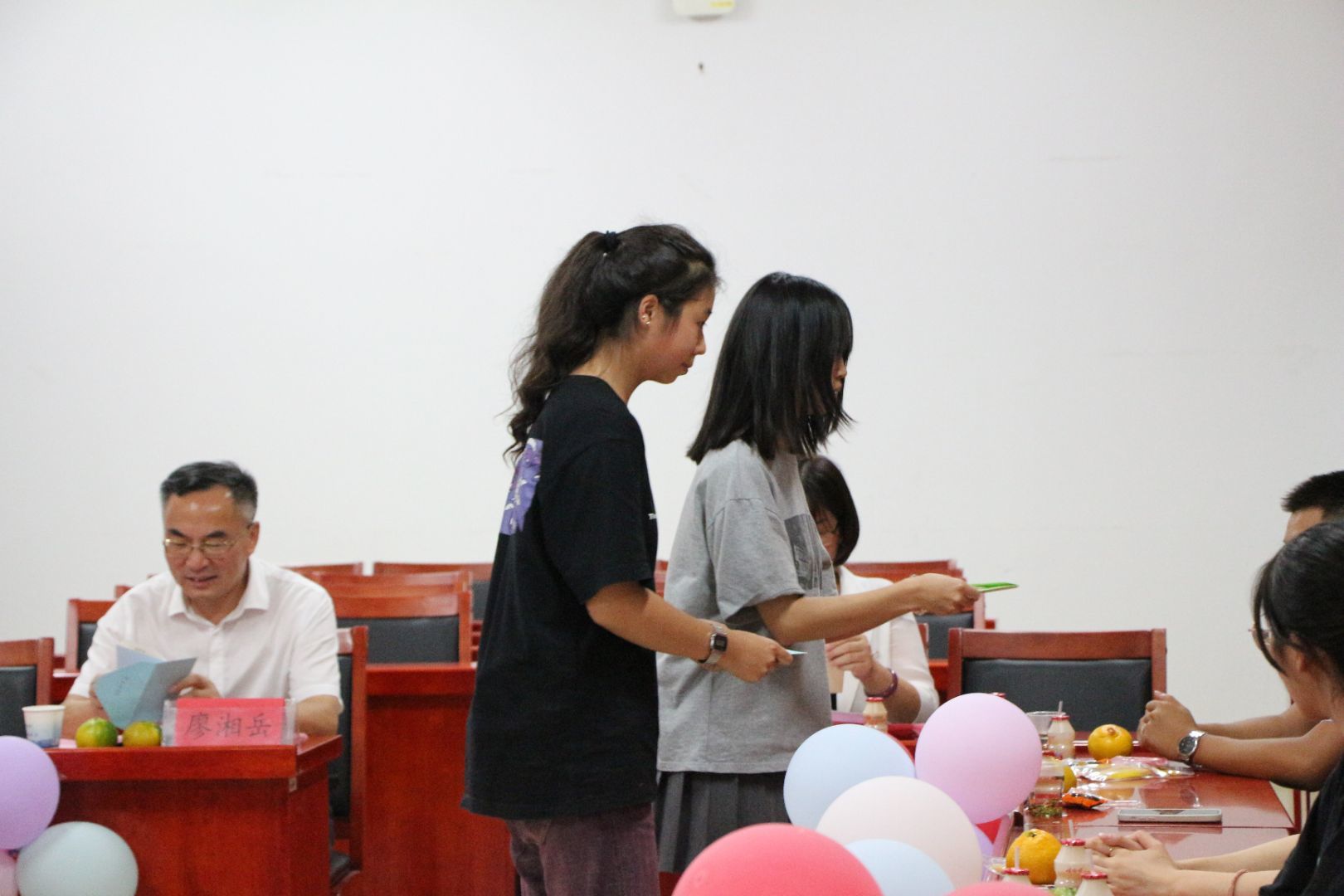 首先,法学一班同学为到场老师献上一张张精心准备的贺卡。小小贺卡,要写的太多,能写的太少,能写下的是学生对老师最真诚的感恩与祝福,写不下的是学生与老师最难以割舍的师生情谊。学生送,送的是感恩与祝福,老师收,收的是感动与幸福。随后,师生一道观赏视频。在轻柔的音乐声里,大家一起回顾过去的一年的生活中的点点滴滴,感受着彼此从军训到课堂,从陌生到熟悉,从青雉到成熟的一次次蜕变。一幕幕温暖鲜艳的画面闪过,在大家平静的心海里漾起一波温柔的涟漪。